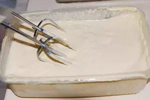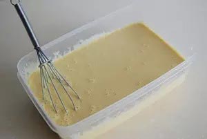 8、等冰淇淋剛開(kāi)始結(jié)冰時(shí)取出容器,用打蛋器攪打一會(huì)兒,之后每隔30分鐘取出攪打一次,共打4次以上即可。