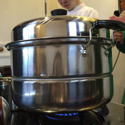 三、蒸豆腐:鍋中水燒開,放入調(diào)制好的原料。中火蒸6分鐘。