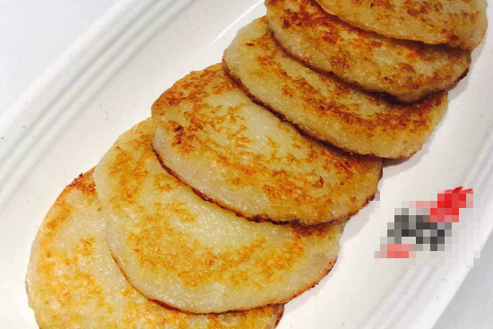 3、燒熱平底鍋,加入適量油,舀一勺土豆面糊,用勺子攤平成餅狀,煎至其底部凝固,翻面中小火繼續(xù)煎,煎至其兩面呈金黃色即可。