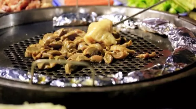 喜歡的食材都可以放進(jìn)去烤,還要用特制的工具不停翻炒,以免一不留心肉類就糊鍋,一塊塊肉在鍋中來回翻烤,顏色變的焦黃滋滋冒著油,油汁肉汁蔬菜汁交融在一起,那味道單是想想就讓人心醉。