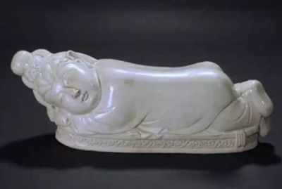 這件宋定窯“美人枕”,長(zhǎng)43厘米,寬15.5厘米,質(zhì)地細(xì)膩,釉色白潤(rùn)如玉,工藝精巧。此枕塑造了一個(gè)豐滿美人的“迷人睡姿”—其雙手枕于頭下,兩腳疊壓稍稍抬起,衣紋線條流暢,盡顯雍容華貴,透露出唐人遺風(fēng)。