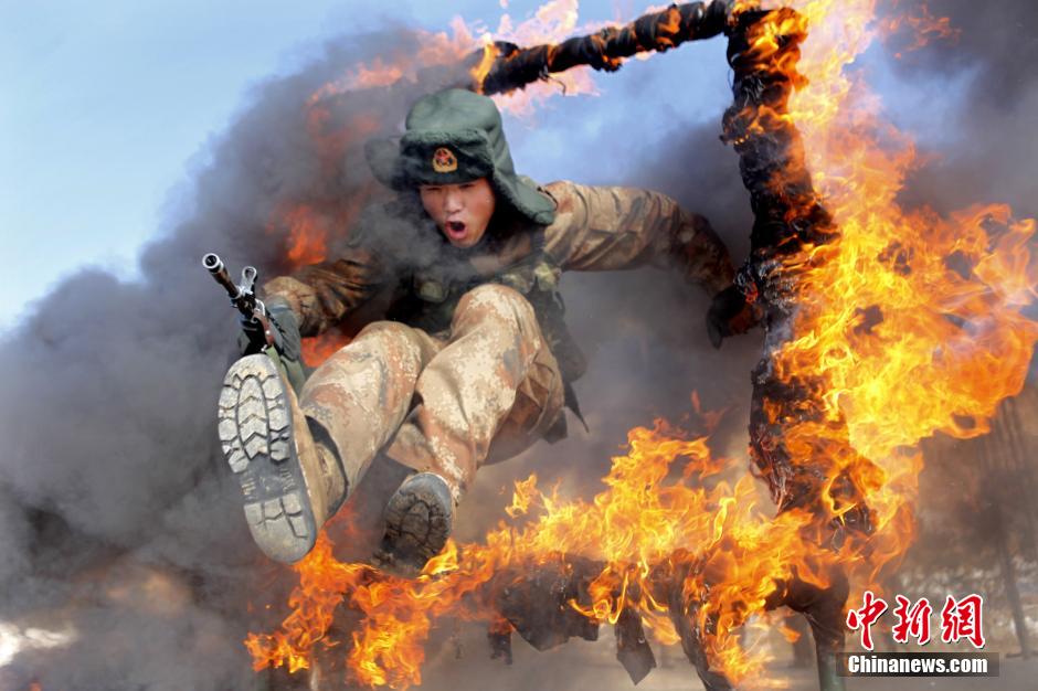 3月5日,黑龍江省軍區(qū)邊防某團(tuán)官兵正在進(jìn)行跨越火圈的實戰(zhàn)訓(xùn)練。該部結(jié)合未來邊境作戰(zhàn)特點,設(shè)置模擬化戰(zhàn)場環(huán)境,營造硝煙滾滾、槍林彈雨、炮聲隆隆的實戰(zhàn)氛圍,從難從嚴(yán)從實戰(zhàn)角度出發(fā),深化“仗怎么打、兵怎么練”的實戰(zhàn)練兵力度,著力提升部隊實戰(zhàn)條件下的作戰(zhàn)能力,錘煉官兵敢打硬拼的過硬戰(zhàn)斗作風(fēng)。中新社發(fā) 魏建順 攝