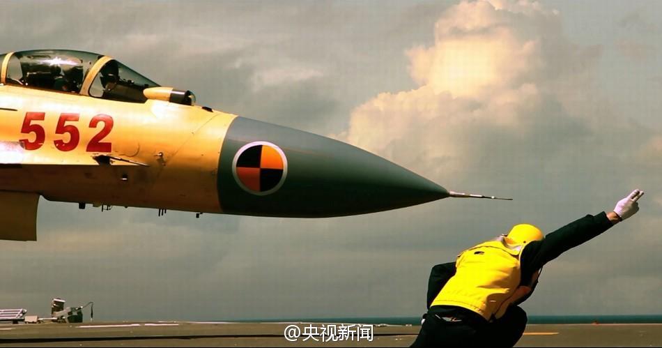 昨天,央視新聞首先在節(jié)目中播出這一視頻。視頻配以恢宏的音樂(lè),記錄了殲15艦載機(jī)在遼寧艦上起飛、著艦的畫(huà)面。視頻以飛行員的日常基本訓(xùn)練作為開(kāi)頭,描述了飛行員做起飛前的準(zhǔn)備工作、飛行中駕駛飛機(jī)及著陸的狀態(tài)。值得注意的是,視頻中,還有近10秒時(shí)間展示了殲15在空中進(jìn)行特技飛行動(dòng)作的畫(huà)面,飛行員駕駛飛機(jī)進(jìn)行翻轉(zhuǎn),畫(huà)面中天空與地面的位置調(diào)轉(zhuǎn)。