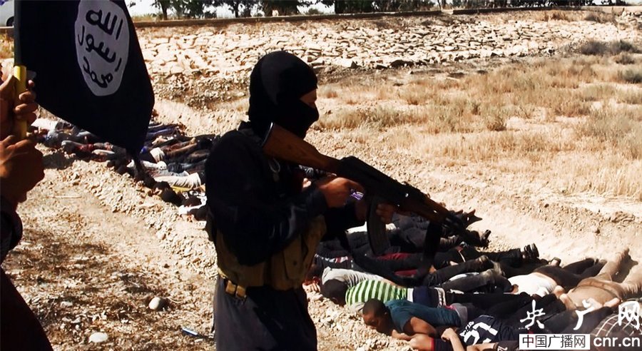 當?shù)貢r間2014年6月14日,伊拉克薩拉赫丁,伊拉克極端武裝“伊拉克和黎凡特伊斯蘭國”武裝人員處決大量俘虜?shù)囊晾耸勘?/p>