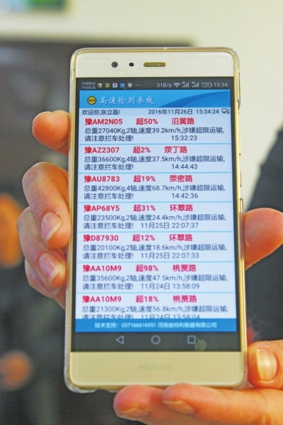 超載信息通過(guò)監(jiān)控裝置實(shí)時(shí)傳輸?shù)街登诮痪氖謾C(jī)中。