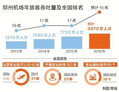 據(jù)鄭州機(jī)場相關(guān)負(fù)責(zé)人介紹,2014年鄭州機(jī)場旅客吞吐量突破1580萬人次,同比增長20%,增速位居全國20個(gè)大型機(jī)場首位。